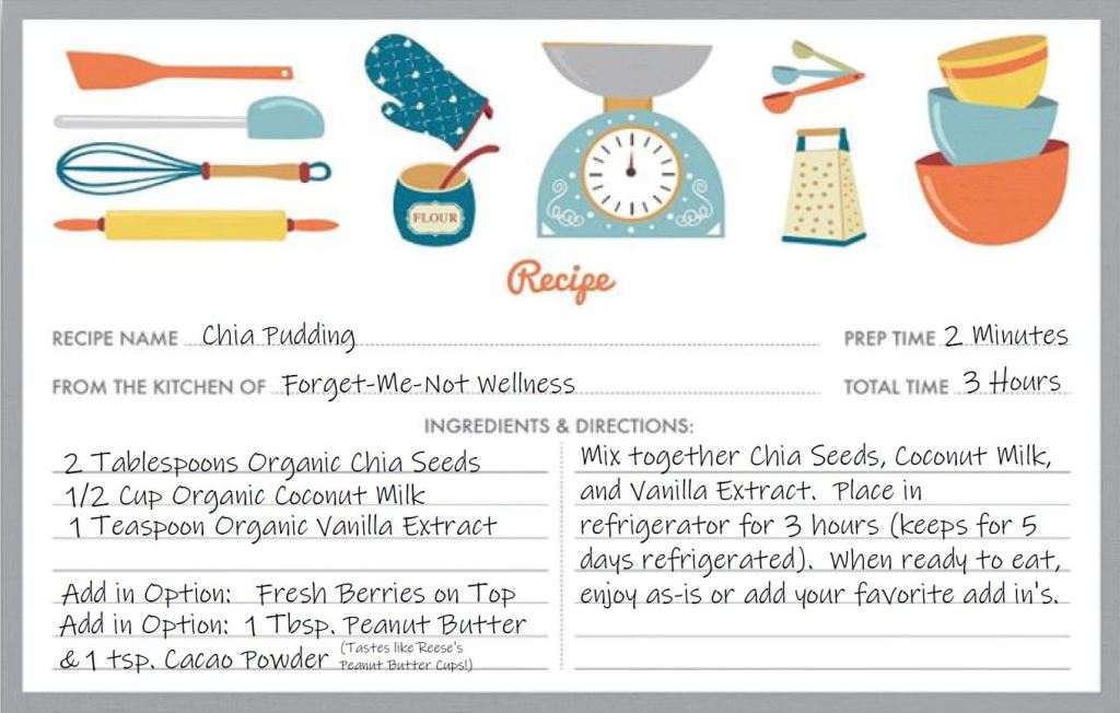 Looking forward to the weekend? So are we! Here at Forget-Me-Not Wellness, we are always looking for ways to improve our family’s overall health. We try to carve out a bit of time for relaxation to unwind and reduce stress over the weekend. One way we try to reduce weekday stress is by doing a bit of food preparation over the weekend. For us, this includes meal planning for the week ahead and prepping as much as possible for the week. Usually, this doesn’t take more than an hour or two but saves so much time throughout the week. This not only allows us to make better choices throughout the workweek, but it gives us extra time with our families when we are not constantly thinking about meals and snacks. One of our favorite on-the-go-breakfast options is a quick chia pudding.