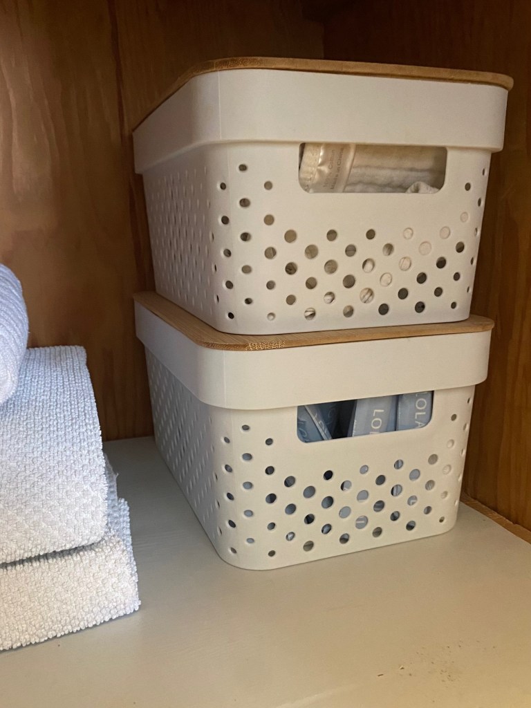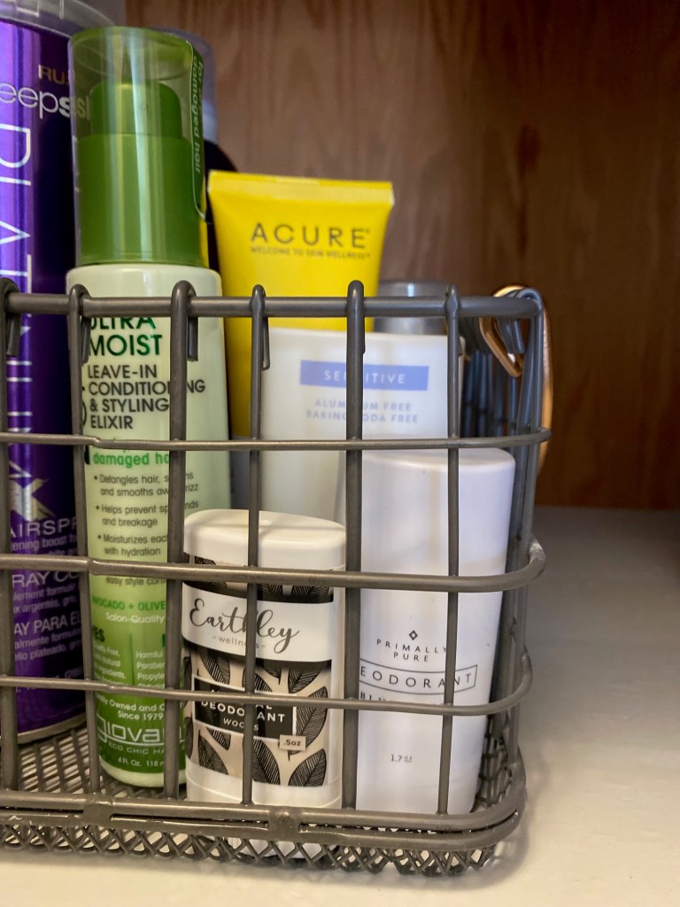 I chose the bathroom and linen closet first. Our small home does not offer a lot of storage, so everything for our bathroom as well as medications, etc. all live in this closet, and it is used continually throughout the day. First, I took EVERY. SINGLE. THING. out of the closet and placed it all on our kitchen table. It always amazes me how much we collect over time. Living in a small house, I try not to purchase too many duplicates of things which is helpful in reducing waste. But, we still had much more than I thought we did! The first thing I did was go through all of our personal care products and tossed anything that was expired or not in use. How many unnecessary hair products that don’t actually work for your hair do you need? The answer: zero. I struggle with knowing I spent money on something and then tossing it (or, preferably, passing it on to someone else that could use it). But, the reality is you are never going to get that money back. But, holding onto it is costing you mental clutter and potentially more money (because you have to buy baskets/etc. to store all of the unused stuff).