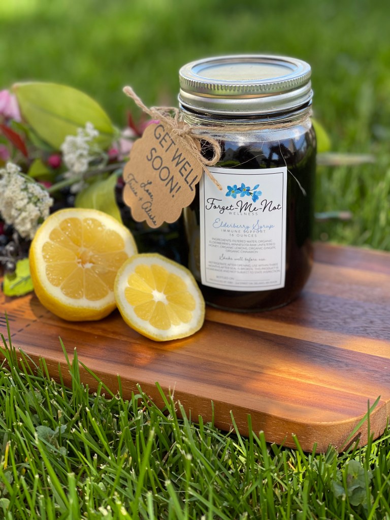 Elderberry is a high antioxidant berry offering many benefits. This immune-boosting syrup is made with organic dried elderberries, unfiltered raw local honey from Le Seuer, MN, organic ginger, organic lemon juice, and organic cinnamon. Take this product alone or with warm water to make a soothing tea. This product is shelf-stable for a year and needs to be refrigerated after opening. After opening, we recommend using it within six weeks. Serving Size: 1 Tablespoon for Adults and 1 Teaspoon for Children as needed.